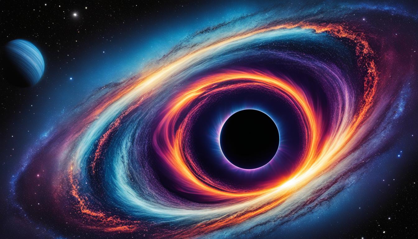 Another mind-bending aspect of black holes is how matter and energy act near their event horizon. This is the point where nothing can escape the black hole’s gravity. Matter gets stretched and distorted, showing us things that seem impossible.