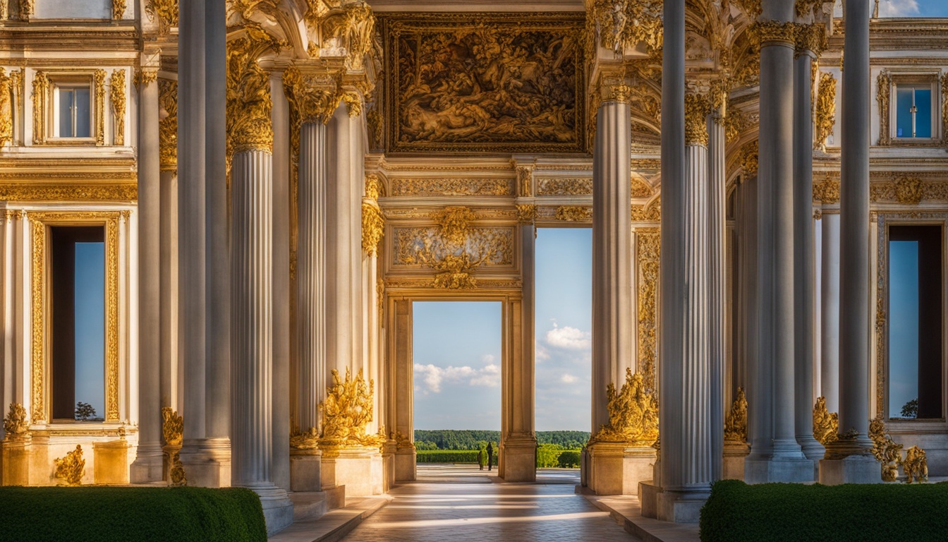 The baroque architecture of Versailles is a wonder of human creativity. It mixes detailed ornate decorations with big, sweeping designs. The palace’s fancy carvings and moldings show off its lavishness. At the same time, its big designs show power and grandeur. It’s a true work of art, showing the skill and vision of its creators.